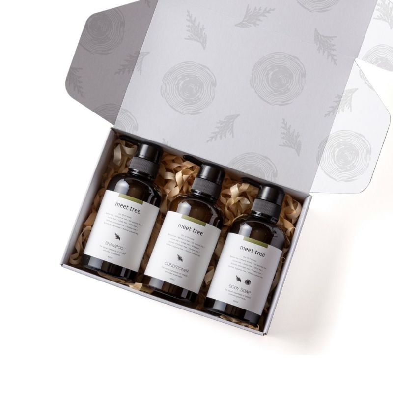 シャンプー、コンディショナー、ボディソープのバスケアギフトセット。バスタイムの時間がヒノキの爽やかな香りで包まれます。