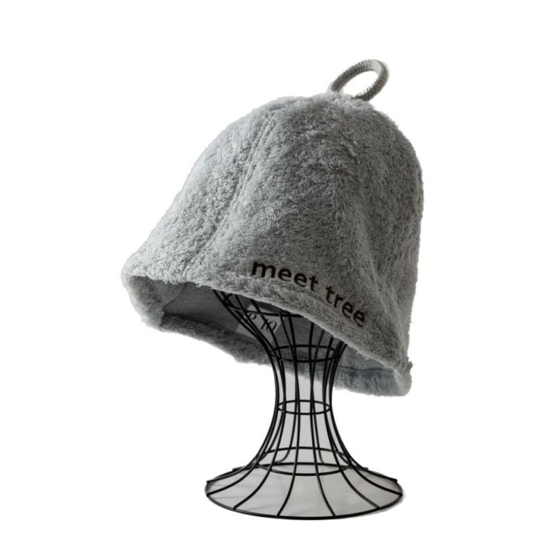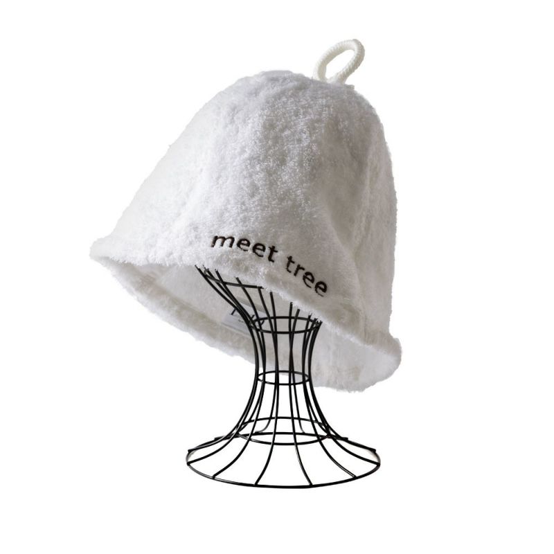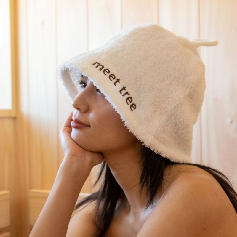 同じ岐阜県に本社を置く浅野撚糸株式会社のエアーかおるとコラボした、meet tree SPAのオリジナルサウナハット。一度使うと忘れられない驚きの吸収力で、しっかり水分を吸い上げます。オーガニックコットンを使用し、敏感な肌にも優しいタオル素材で作られています。